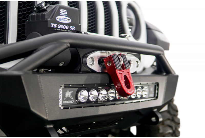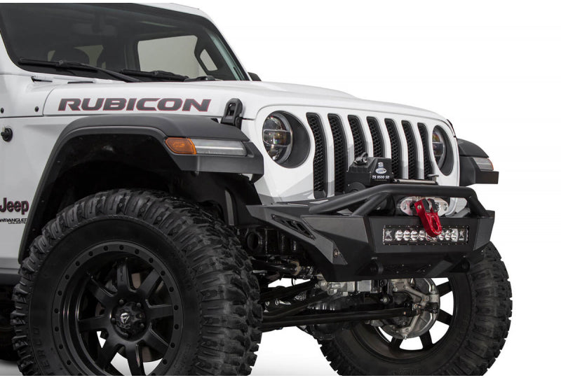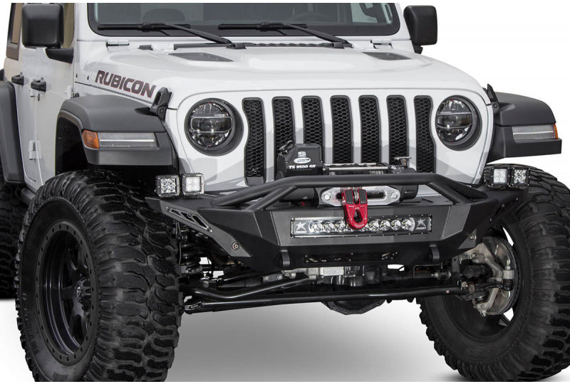 When choosing your front bumper on your Wrangler JL or Gladiator JT, consider what your plans are for your Jeep. Are you going to do some weekend excursions or are you going to get in some more serious trails. Wherever the road takes you the Stealth Fighter Front Winch Bumper stands up to it's name giving you are great bumper. This stubby bumper gives you the extra clearance you will need when navigating those rock climbs along additional features that will come in hand when out on the trails. Gives you the ability to mount a winch to help you get out of sticky situations while on the trails. A light bar cut to fit a 20" LED light bar or 5 cube lights in to help light up those trails. High angled corners for those better approach angles as well as two additional light mounts on each corner for more lighting if chosen to do so. D-ring mounts to accept 3/4" D-rings for recovery points. Low profile grille guard for added protection from trail debris.