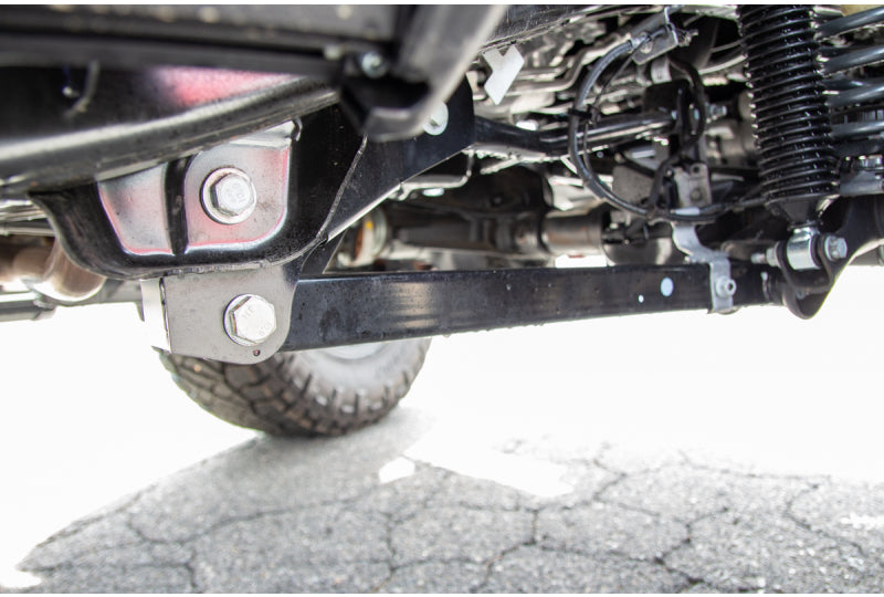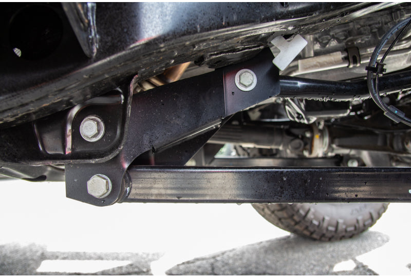 The AEV Geometry correction brackets are included to improve front impact ride quality (expansion joints, ledges), increase anti-dive for improved braking performance, decrease the operating angle range of the front driveshaft, and eliminate the need for adjustable control arms or cam bolts for caster correction.