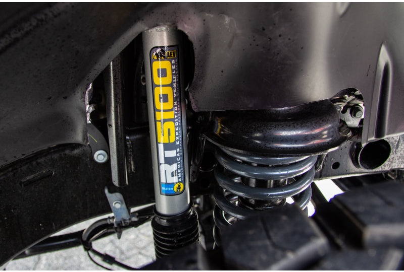 The 2.5” DualSport RT Suspension System includes AEV-tuned 46mm Bilstein 5100 series shock absorbers. We have been using these shocks in our suspension systems for well over a decade for a reason – they are very high quality and ideal for most driving conditions. However, we are working on a remote reservoir shock package as well for customers who require a more robust shock option for severe duty applications.