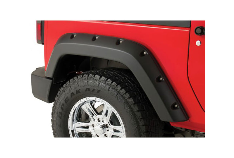 Bushwacker Pocket Style Flares are easy to install with no drilling required. The flares come in a Matte Black Finish to match any color Jeep and are UV protected with Dura-Flex® 2000. Each set comes with a driver and passenger side, front and rear flare with recessed stainless steel bolts.
