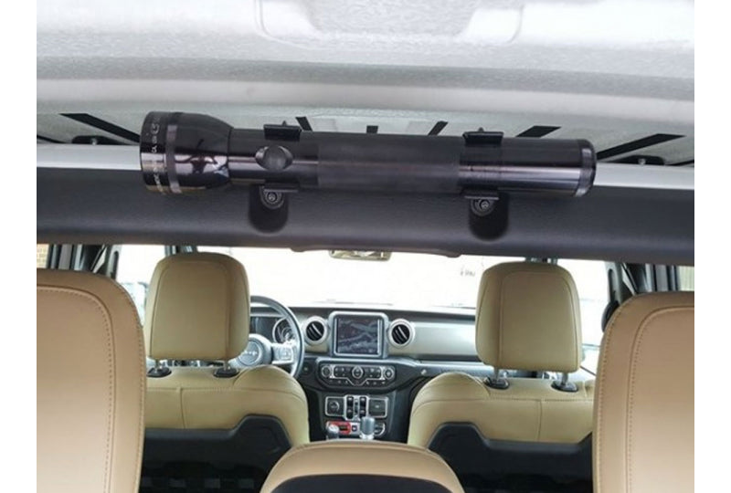 This JL Flashlight mounting bracket is a simple and easy way to install a holder for your flashlight in a Jeep Wrangler JL. The mounting bracket comes with Mag-Lite clips and is designed to bolt directly to existing mounting holes on the rear Sports Bar of the 2 Door JL only. The 4 Door JL will require some cutting/drilling. This mount fits up to 4-D cell flashlights and is ergonomically designed to be easily accessible from the seated position, while still inside your Jeep.