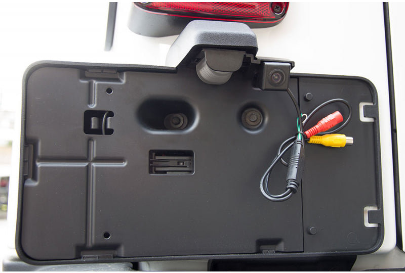 Easily mount a backup camera to your Wrangler! This backup camera snaps into place and replaces the stock license plate light cover. Compatible with any any device that accepts a video input. This accessory is great for those with a larger-than-stock spare tire, or when the rear window becomes obstructed by passengers or cargo.