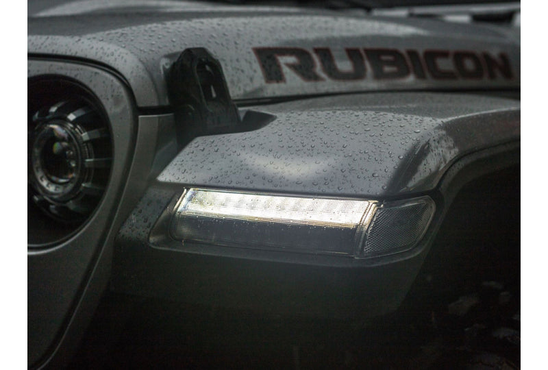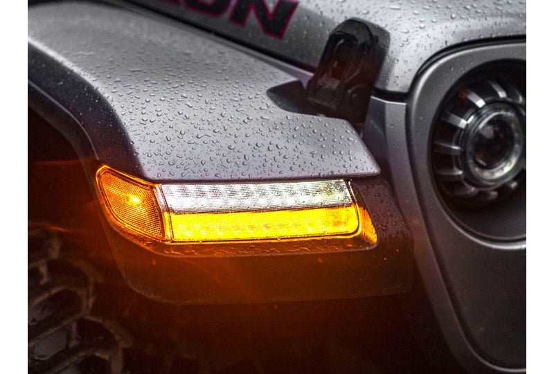 These combination Daytime Running Light (DRL) and Turn signal assemblies will swap directly in place of the original lights, include smoked LED side markers, use all of the stock mounting points, and should only take around 30 minutes to install. These Jeep Wrangler LED turn signals and side markers are an instant upgrade for Wrangler JLs & Gladiator JTs with the halogen and upgraded LED package. Wiring harness is included and will plug into the factory connectors for the stock lights and is a true plug and play.