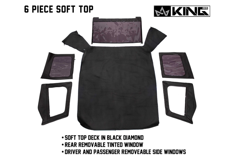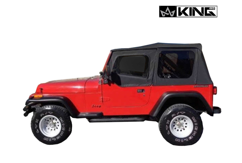 The King 4WD Premium Replacement Soft Top for the 1987-1995 Jeep Wrangler YJ models is constructed from 24oz marine-grade, waterproof, and UV-stable two-layer fabric. This durable material ensures that the soft top withstands harsh weather conditions, protecting the vehicle's interior and enhancing the Jeep's longevity.