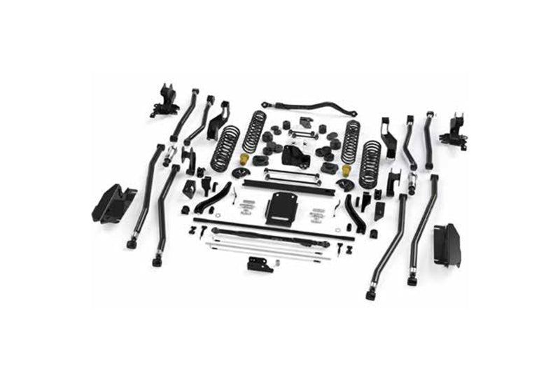 The all-inclusive TeraFlex Sport RT4 Suspension System delivers true rouge trail performance and capability in a dependable and maintenance-free package! Developed for the Jeeper looking for a stable commute and comfortable trail performance, the 4.5” Sport RT4 Suspension System features all eight adjustable Alpine Long Control Arms. The Alpine Control Arms optimize steering geometry for improved highway handling. The additional lift height over factory clears larger diameter tires without compromising on- or off-road stability. The RT4 also adds Alpine Forged Adjustable Front and Rear Track Bars that improve steering response and helps center the axle to optimize vehicle roll center. This system also includes SpeedBump Front and Falcon Progressive Rear Bump Stops that provide progressive compression during high-speed suspension movement. These maintenance-free suspension systems provide superior on-road ride quality and comfort with maximum off-road flex. All TeraFlex suspension systems provide reduced noise, vibration, and harshness (NVH).